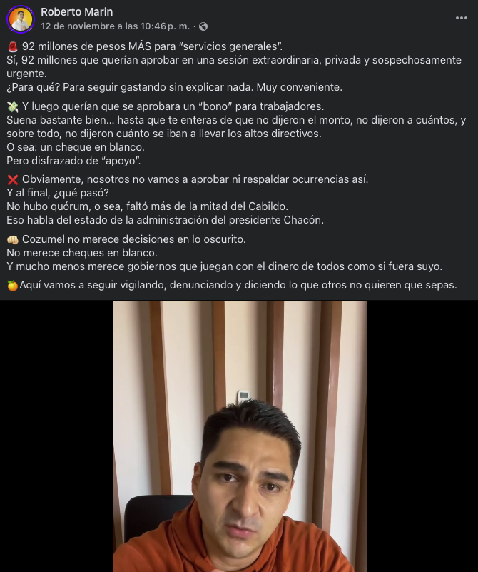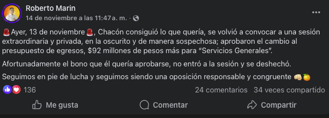 Marín Flores denunció haber sido convocado a una sesión extraordinaria, la cual al final no se llevo acabo, por que no hubo el quórum, pero se tenia una propuesta para aprobar 92 millones de pesos más en “Servicios Generales” y un bono sin información clara sobre montos ni beneficiarios, para el alcalde.